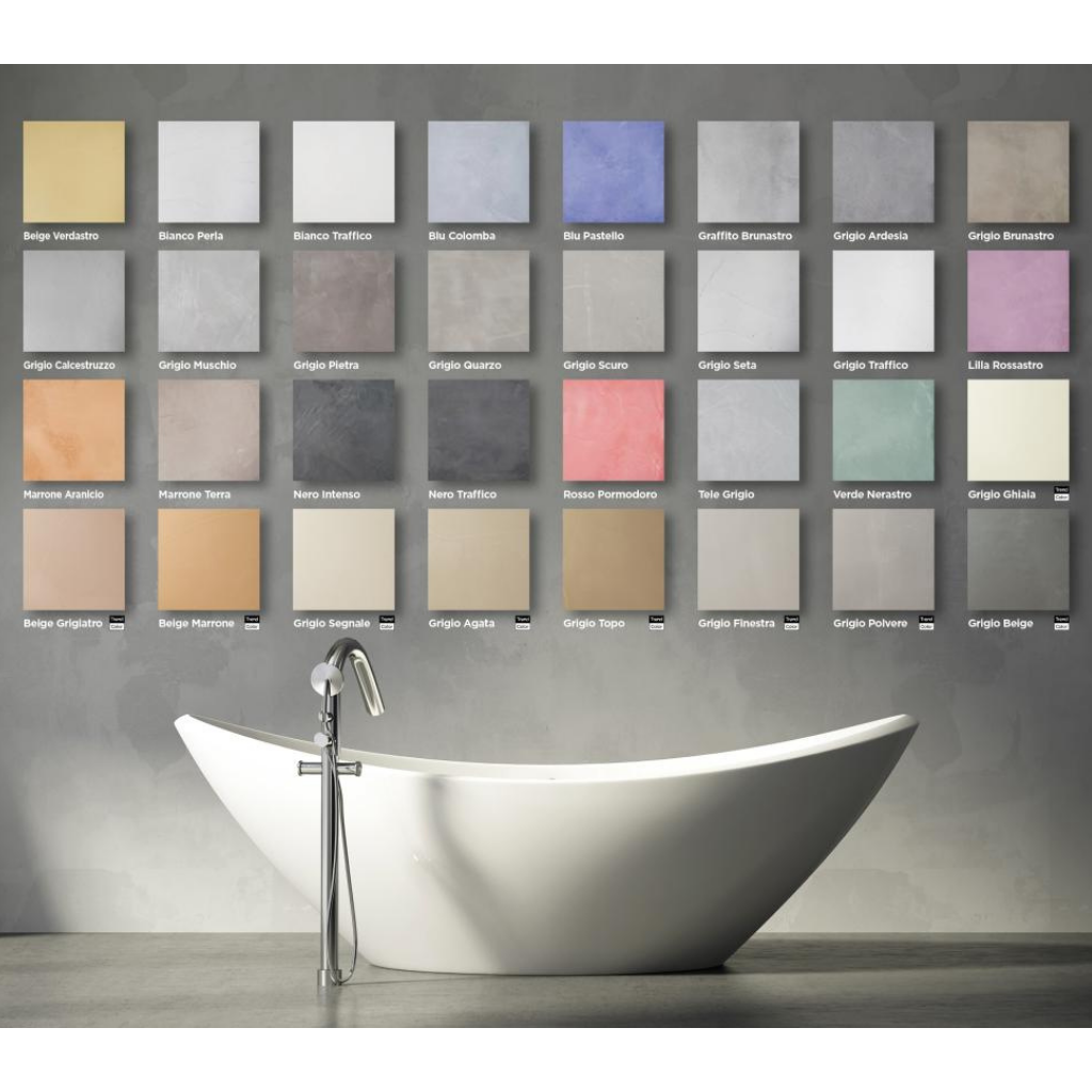 Erhältlich in 23 Standardfarben und 9 Trendfarben, passend zur modernen Betonoptik in Bad, Küche, Wohnraum oder Gewerbe.