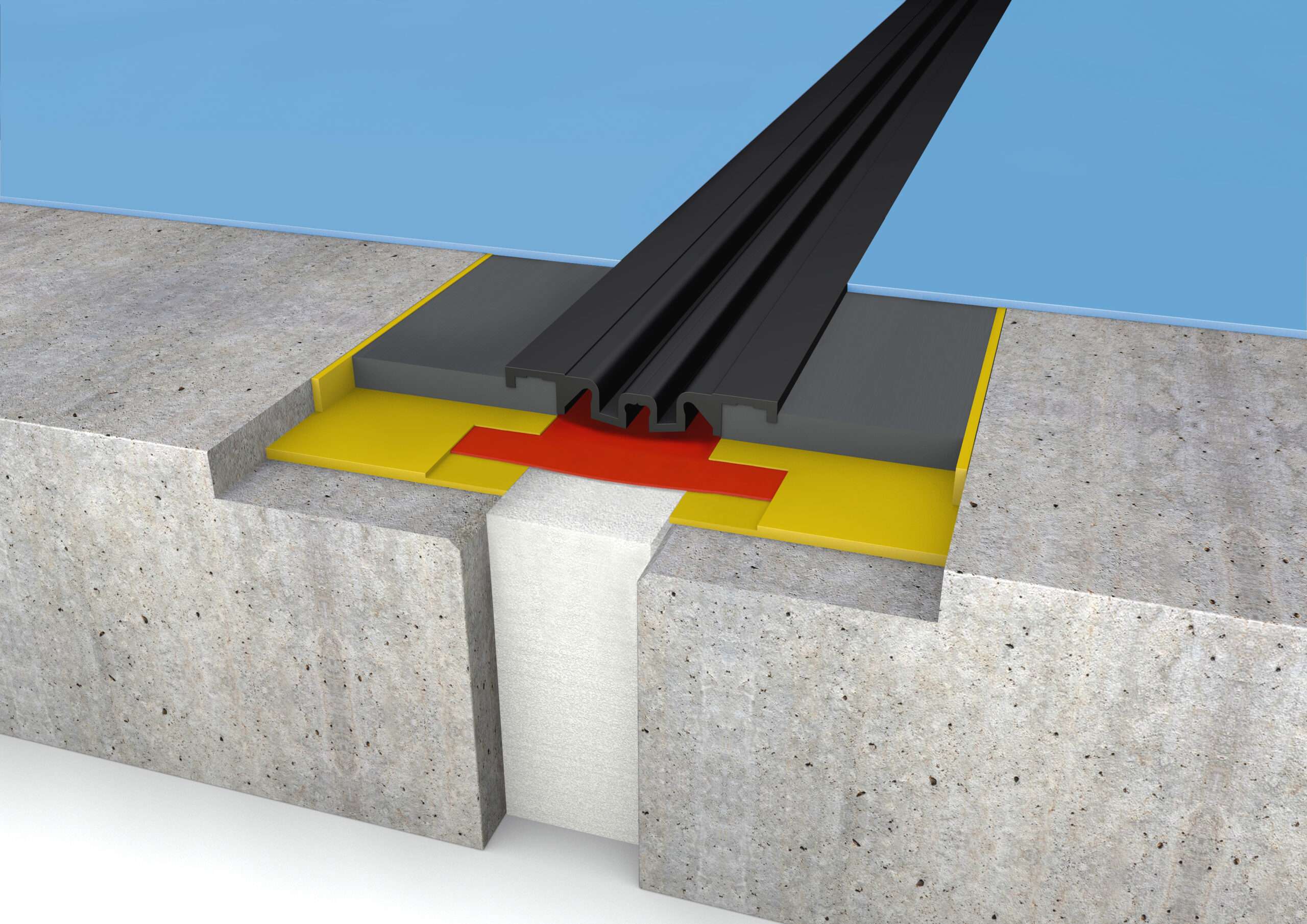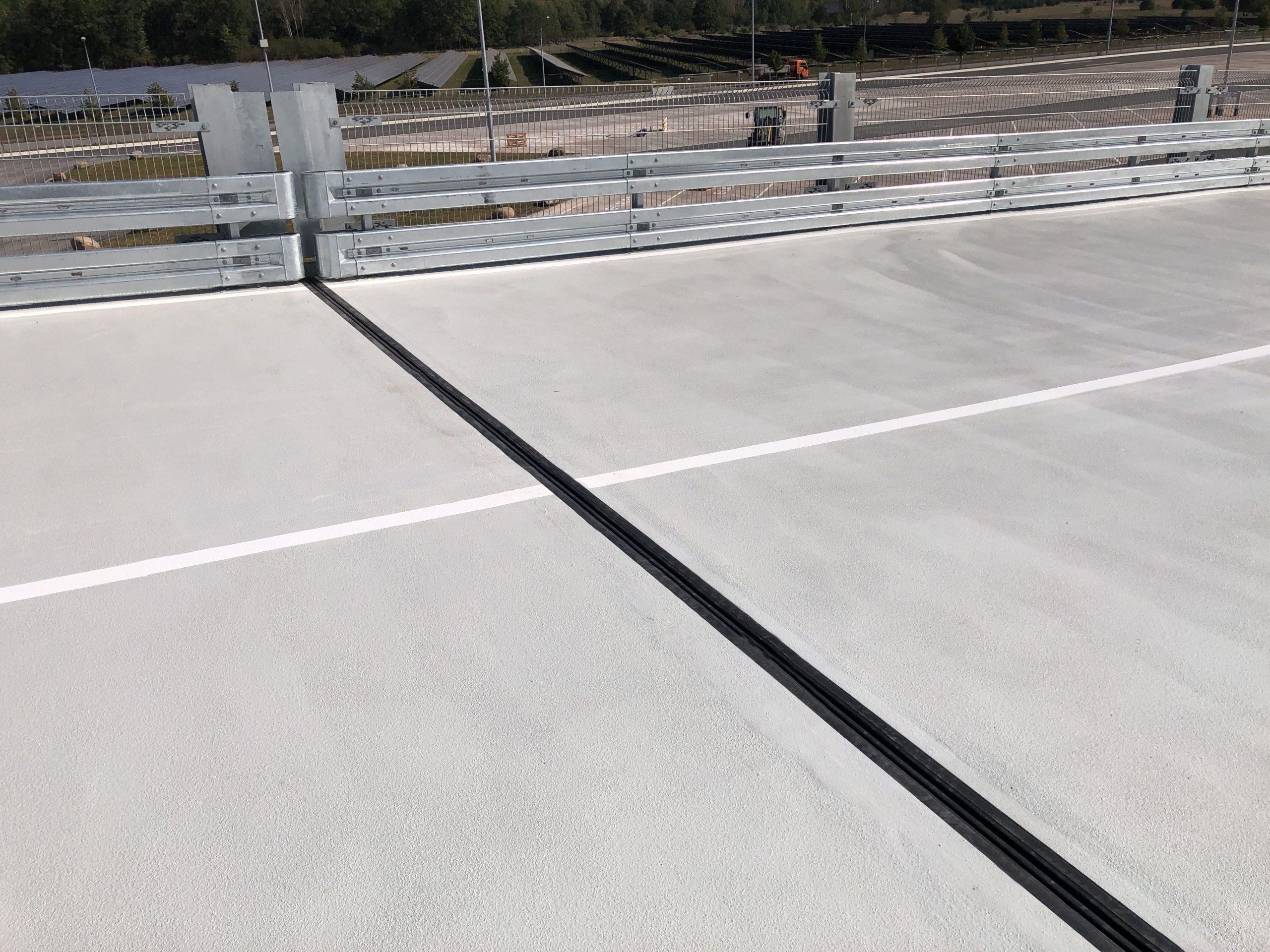 Bodenfugenprofil mit auswechselbarer Dehneinlage für horizontale und vertikale Fugenbewegung im obersten Parkdeck für besonders breite Fugen.